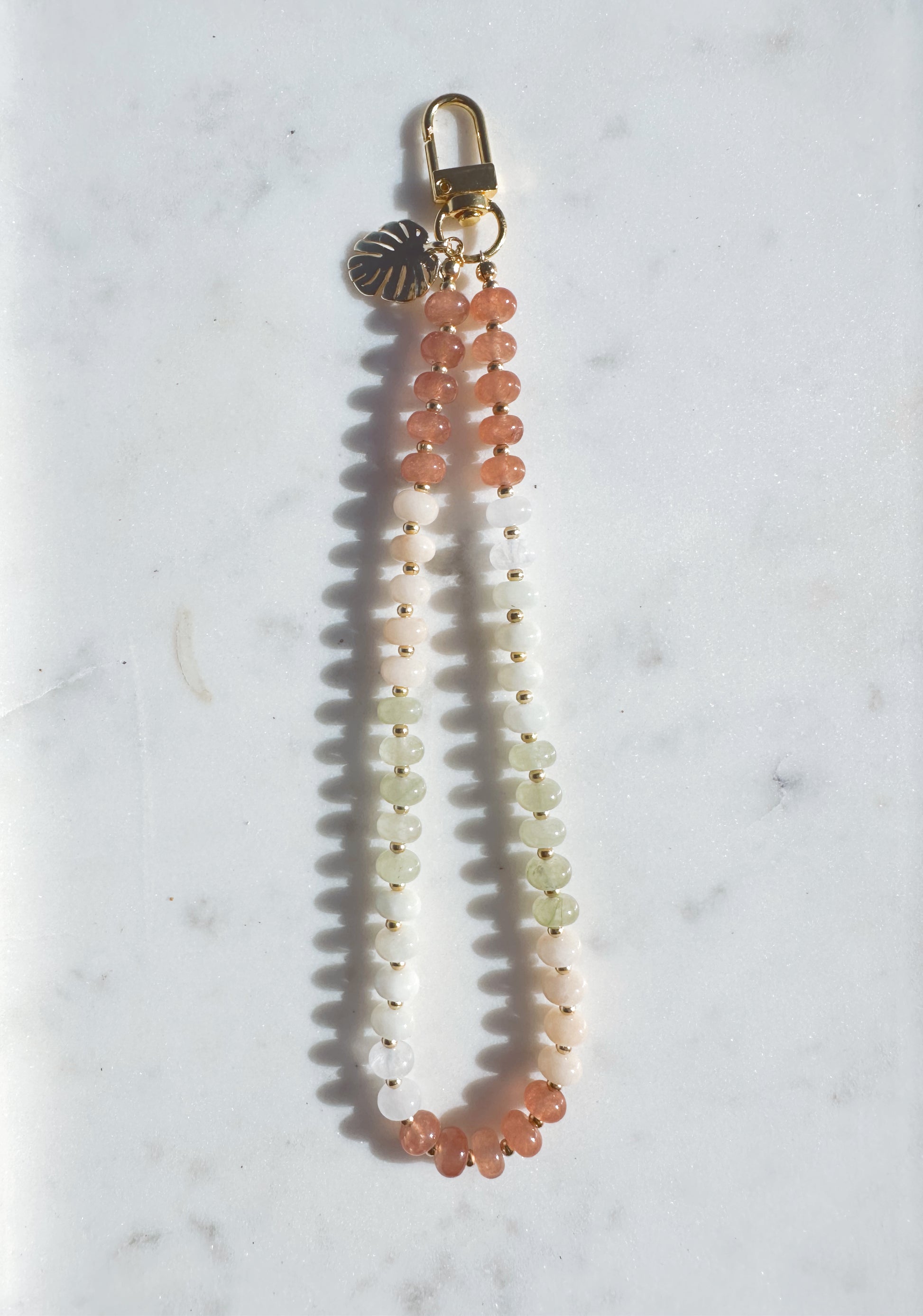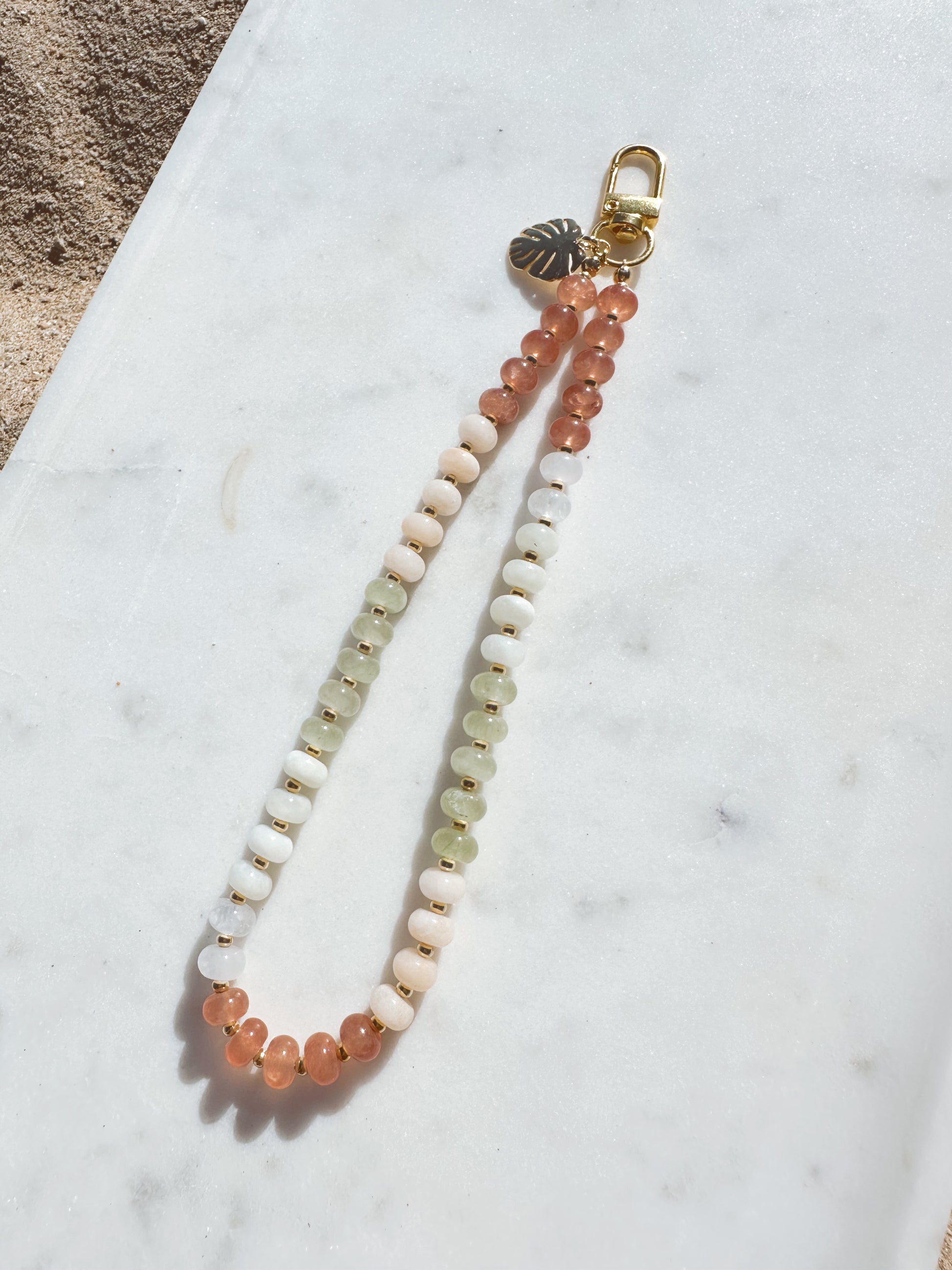 The Malibu Phone Wristlet features smooth, beach-inspired beads that glow softly in natural light. Warm terracotta, creamy white, and soft sea-foam green tones reflect the colors of Malibu at golden hour, giving this piece its effortless coastal warmth. Lightweight, elevated, and designed to keep your phone close while your hands stay free.